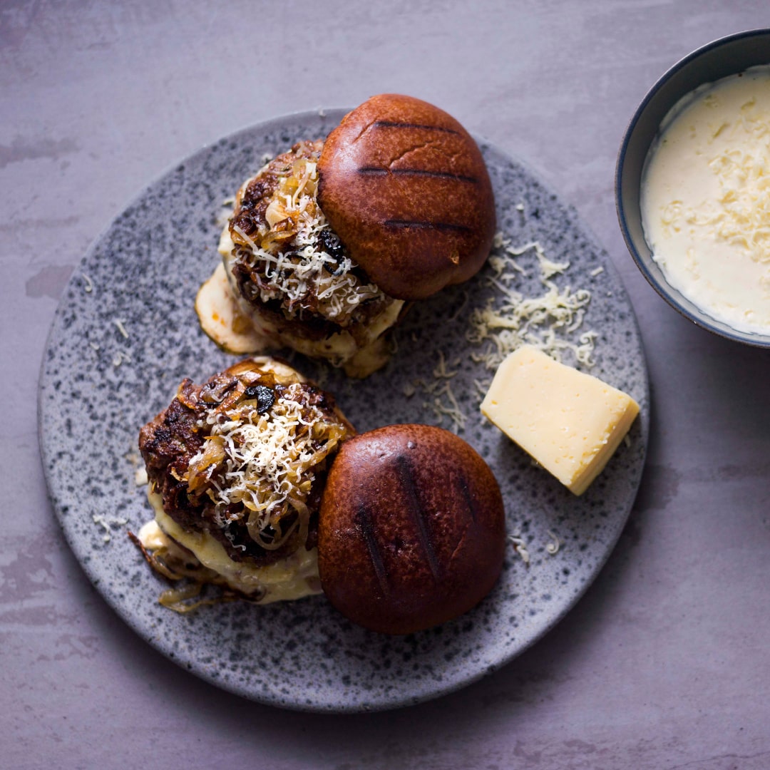 Fantastisk älgfärsburgare med Västerbottensost och aioli. Servera hamburgaren med stekt lök och njut!