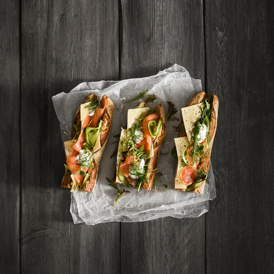 Baguette med skivad Västerbottensost®, rökt lax och dillcrème