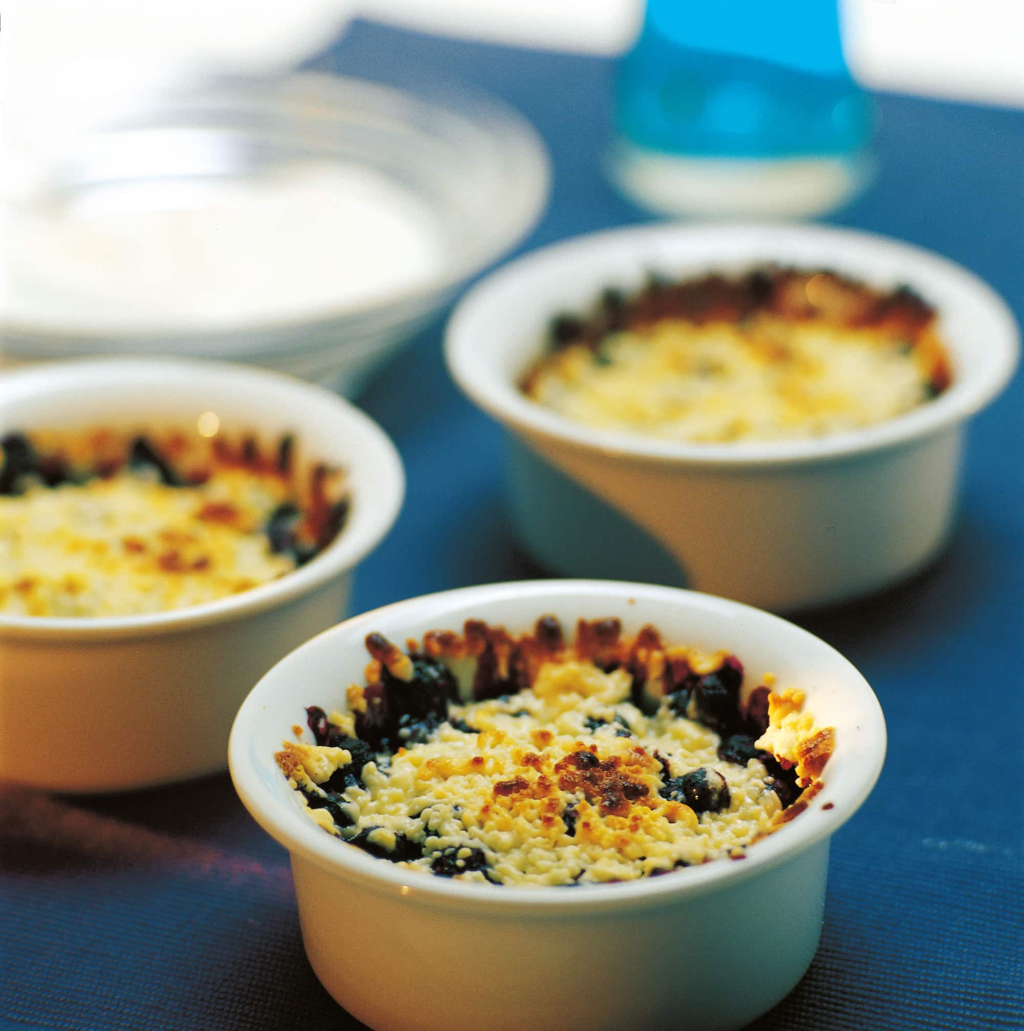 Blanda blåbär med socker och potatismjöl och lägg i ugnsfasta små portionsformar.
