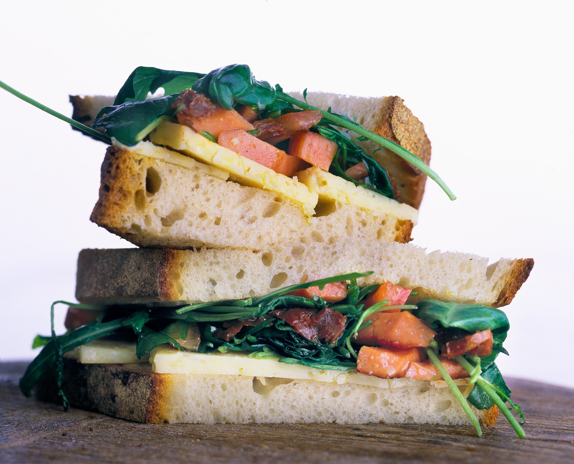 Lägg blandningen på två av brödskivorna, toppa med Västerbottensost och lägg de andra skivorna ovanpå.