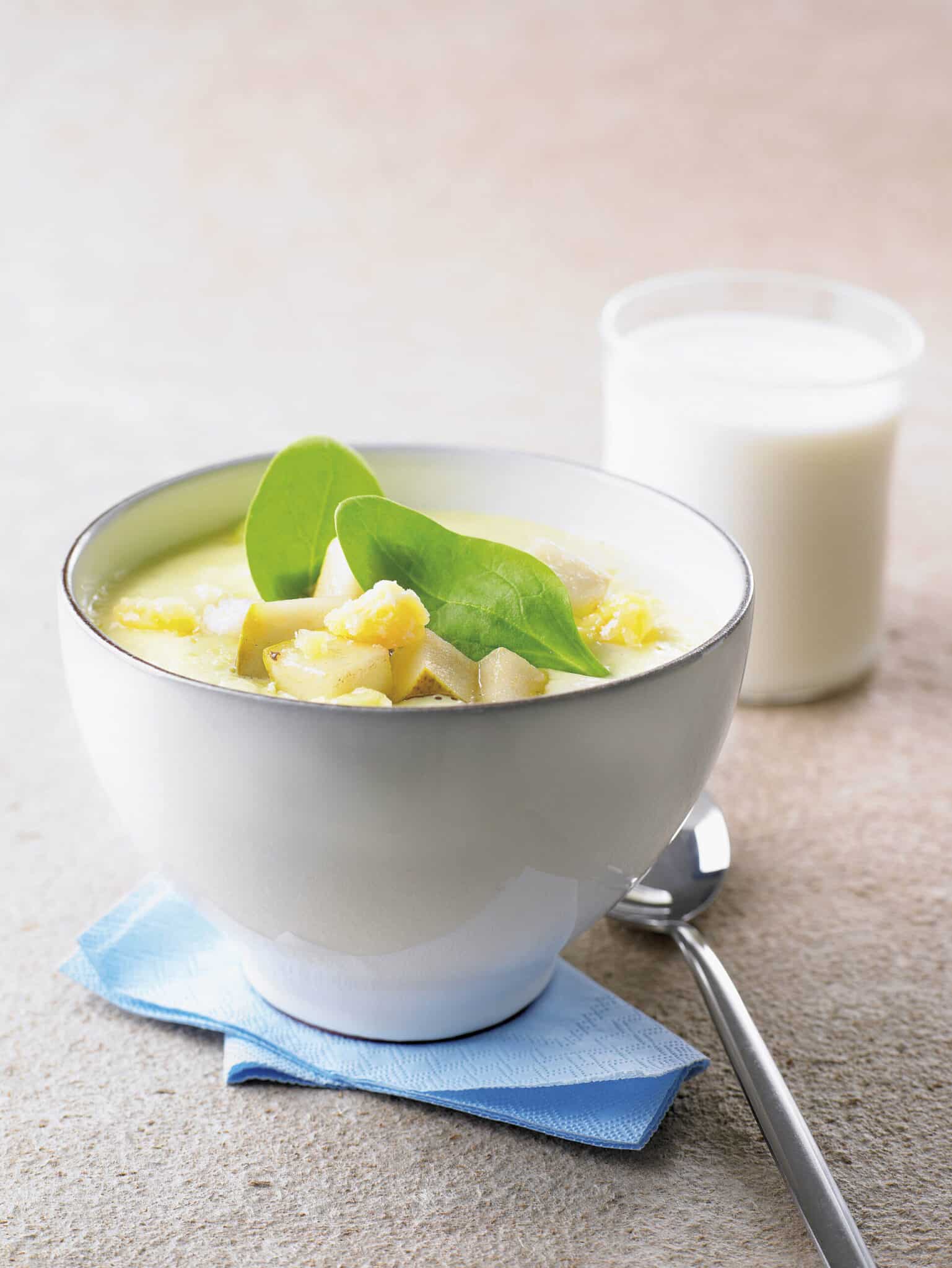 Toppa soppan med stekt päron, smulad Västerbottensost och spenat.