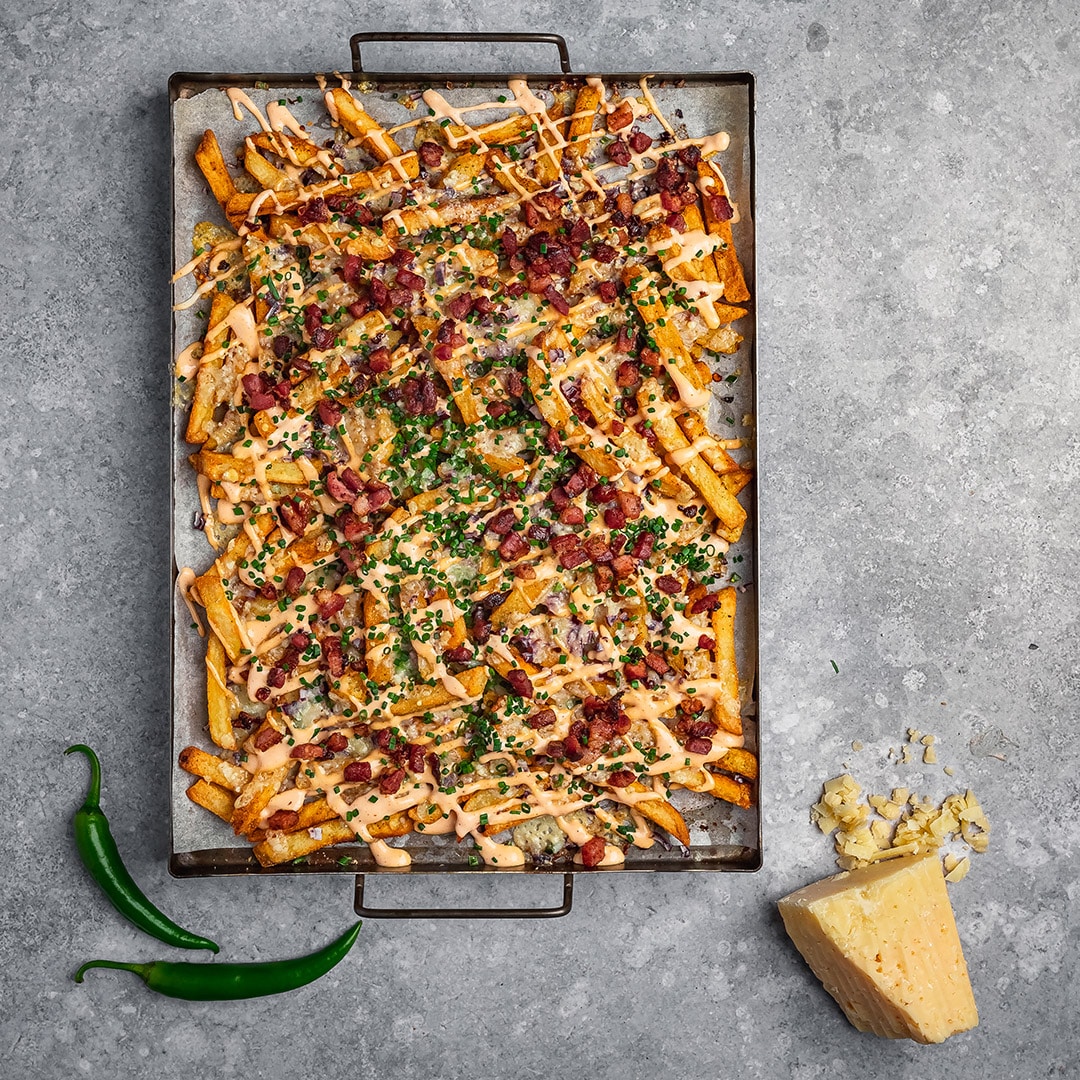 Prova detta recept på ostbonanza med pommes frites, bacon, chilisås och Västerbottensost. Underbart gott recept på hemmagjorda cheese fries!