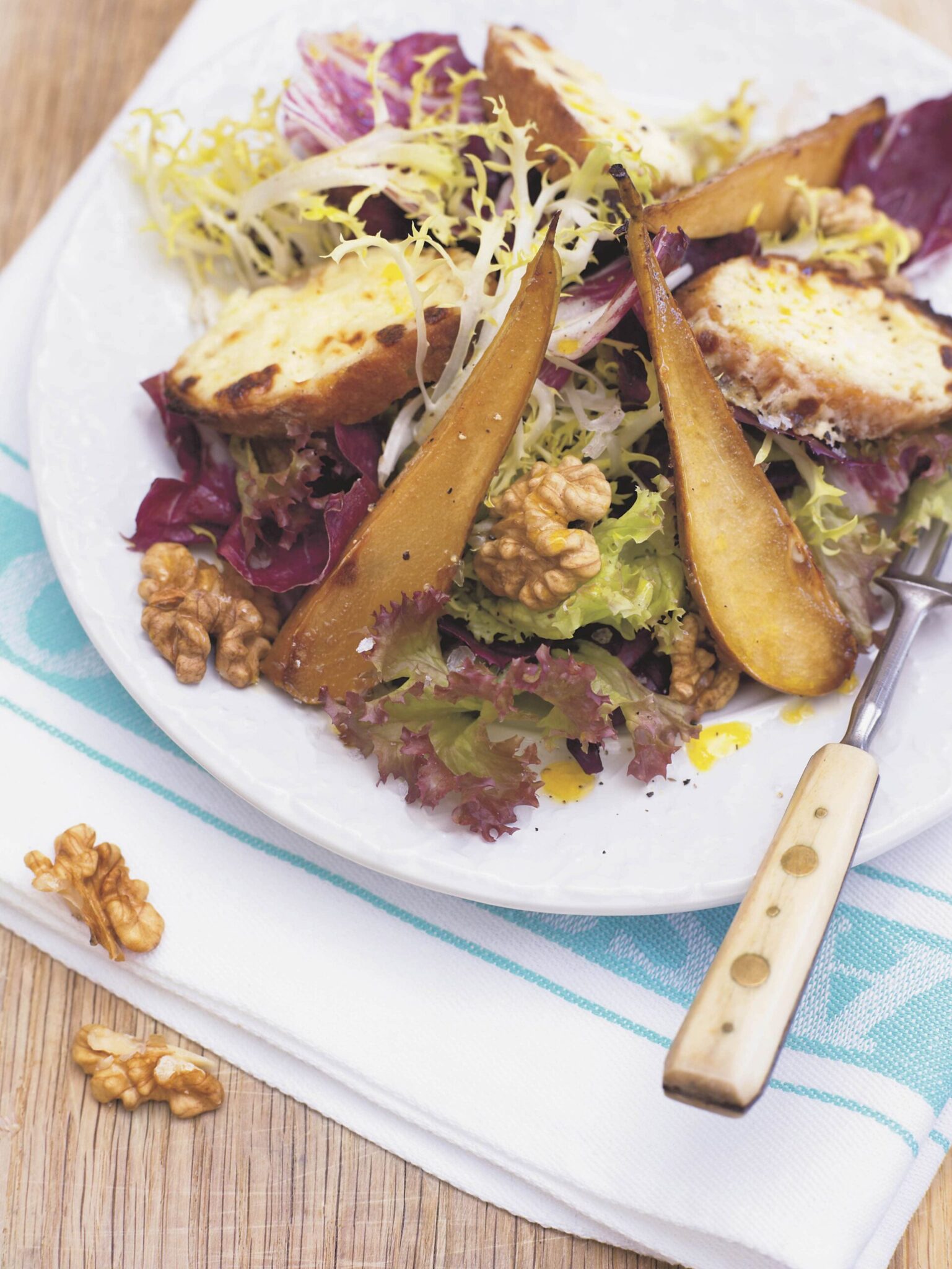 Sätt ugnen på grill 250°. Skär centimetertjocka skivor av baguetten, pensla båda sidor med lite olja och rosta i ugn ett par minuter, tills de börjar få färg. Blanda ost med crème fraiche och lägg en klick på vardera crostini. Skär päronen i 12 klyftor. Pensla dem med olja och lägg dem tillsammans med crostinin på en plåt. Strö lite socker över både ostkräm och päron och gratinera tills ostkrämen fått färg. Ta ut och servera på en salladsbädd. Strö över valnötter och droppa gärna på lite rapsolja. Salta och peppra.