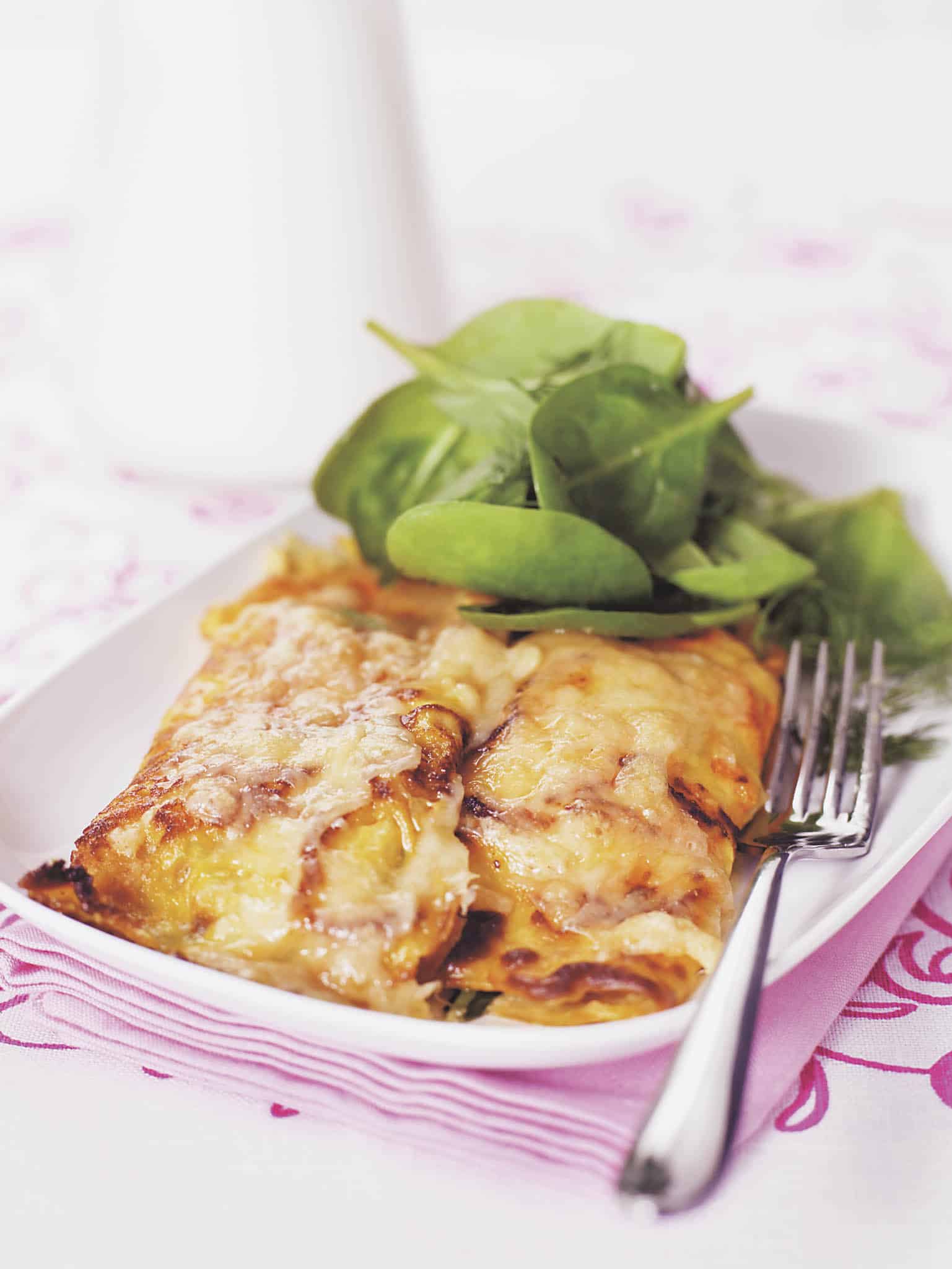 Lägg ett par spenatblad och en klick fyllning på varje crêpe och rulla ihop.