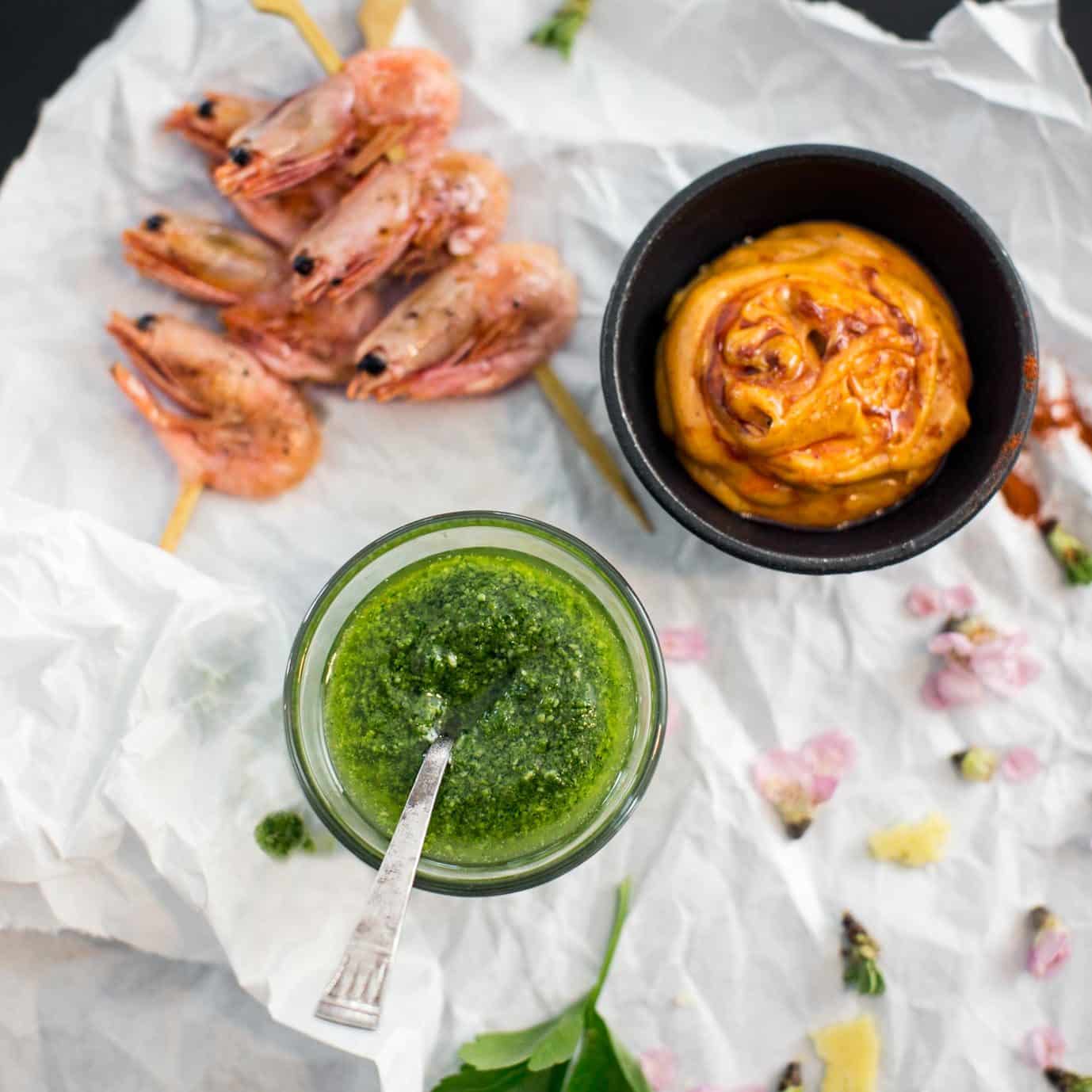 Lägg alla ingredienser i en bunke och mixa med stavmixer till en slät pesto.