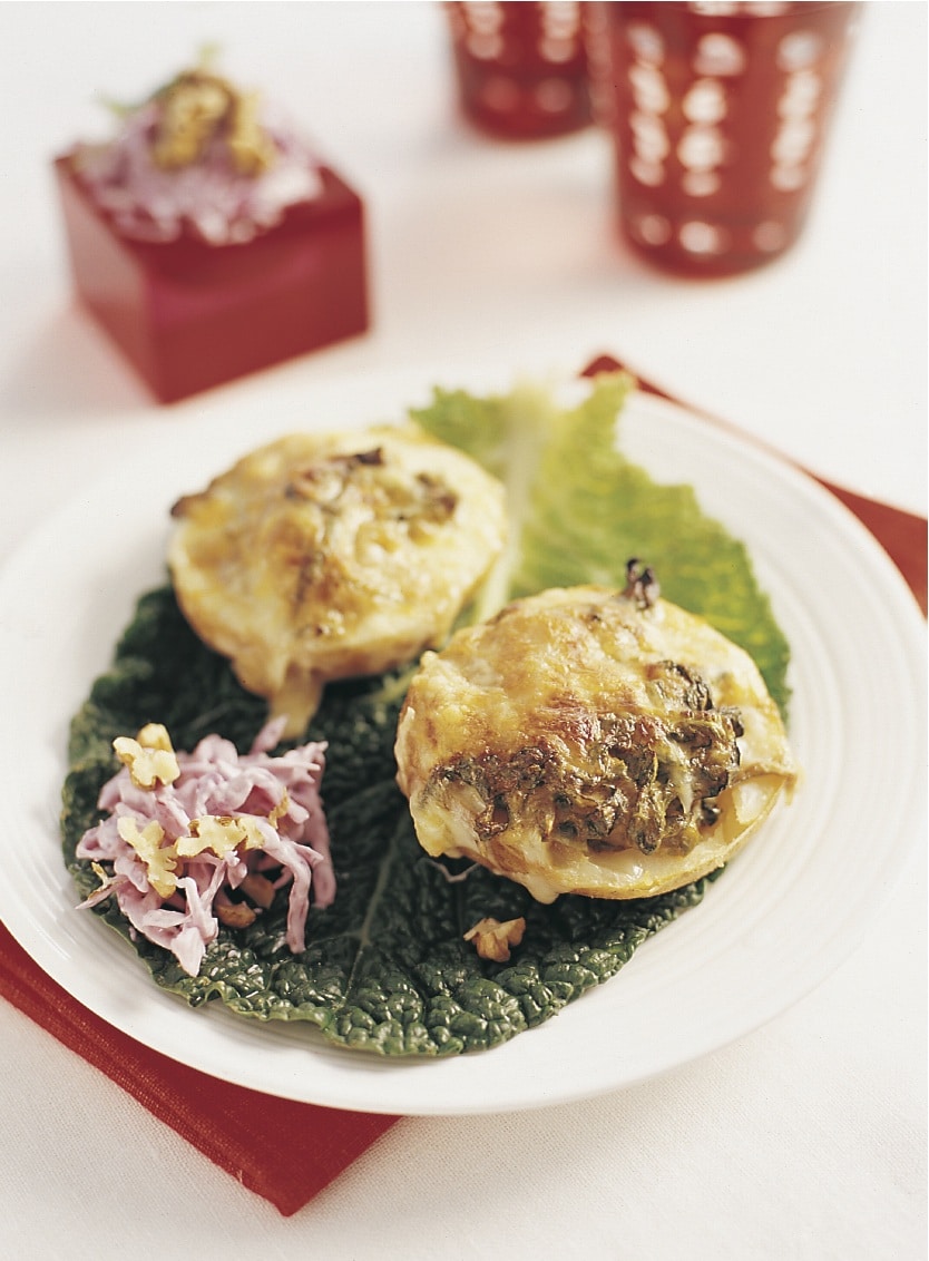 Baka potatisarna ca en timme i 200°. Dela och gröp ”slarvigt” ur dem när de svalnat något. Hacka och strimla under tiden lök, vitlök och grönkål. Fräs detta i smör utan att det tar färg. Klicka på crème fraiche och låt koka ihop i 10 minuter. Späd med vatten eller buljong om det blir för torrt. Vänd till sist ned osten och drag pannan av värmen. Smaka av med salt och peppar. Vänd ihop fräset med det urgröpta ur potatisen. Fyll potatisarna och täck med riven ost. Hit kan du förbereda i god tid. Gratinera i 250° tills potatisen är genomvarm och osten bubblig. Servera med rödkålstzatziki.