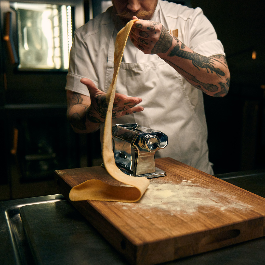 Vispa in mjölet, enklast är att börja med en gaffel. När det börjar forma en deg börjar man använda händerna och knådar tills den blir slät och smidig. Dela upp i två delar, plasta och kyl i en halvtimme innan kavling. Här är det ju enklast att använda en pastamaskin och börja på högsta inställningen och jobba sig ner till den tunnaste, har man inte en sådan går det alldeles utmärkt att använda en helt vanlig brödkavel. Dela pastarken i lagom långa bitar rulla försiktigt ihop och skär ca 2 cm tjocka remsor. Kokas i välsaltat vatten ca två minuter.