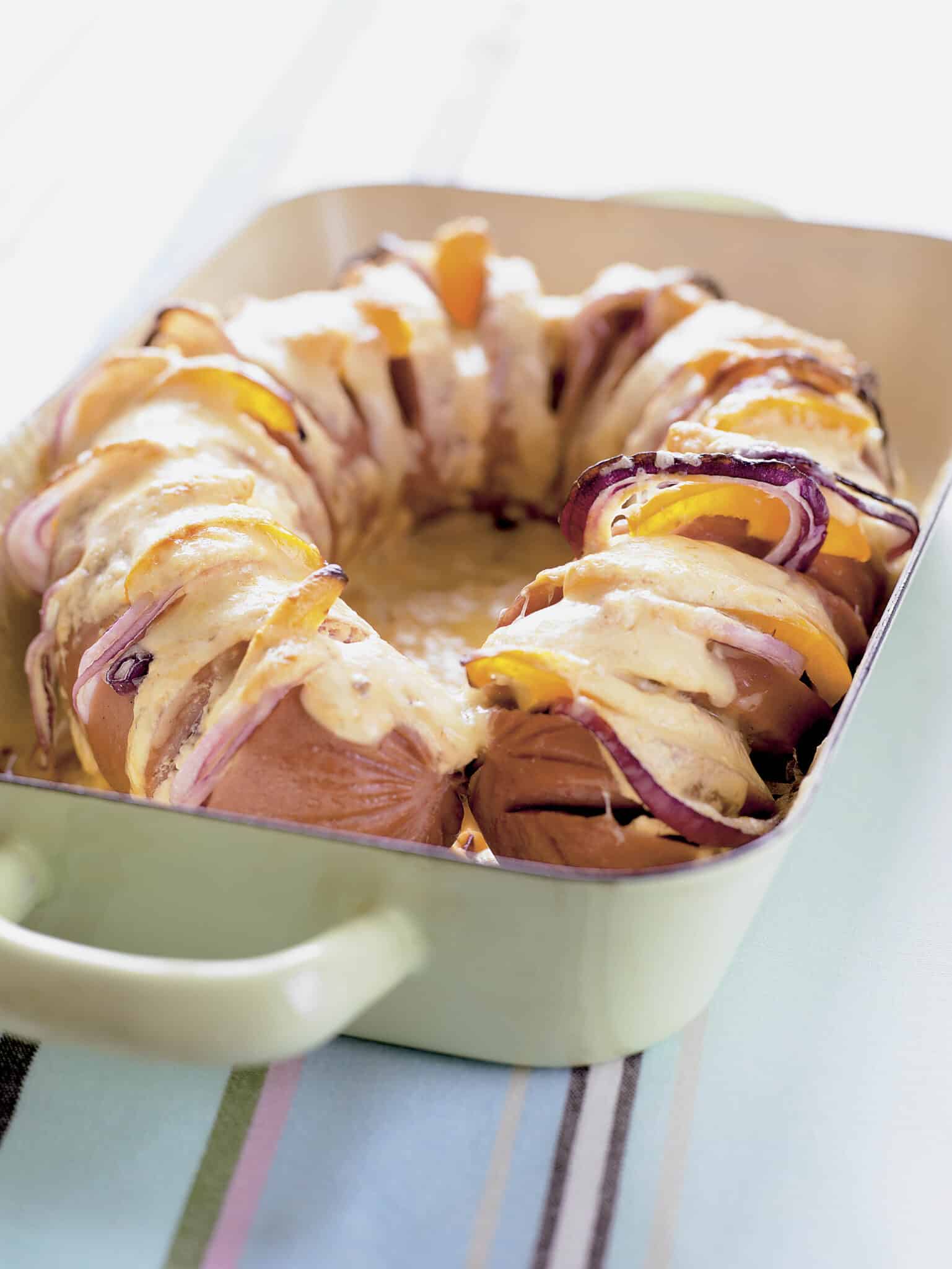 Lägg den i en ugnsfast smörd form och fyll skårorna med paprika och rödlök.
