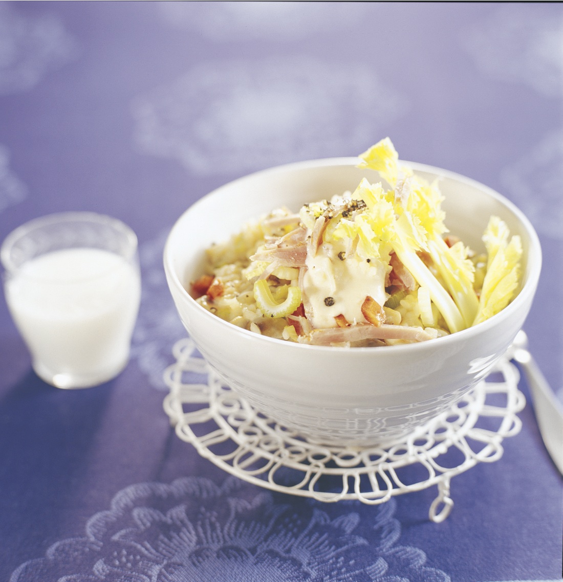 Servera med strimlad blekselleri, strimlad kassler och fint tärnad röd paprika.