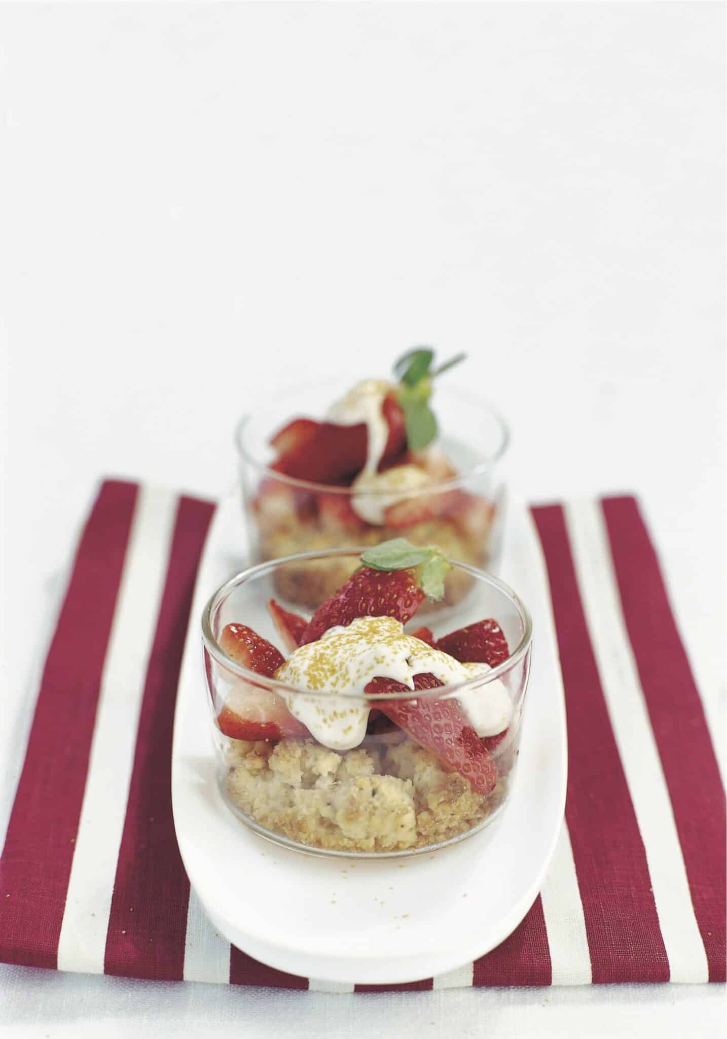Sätt ugnen på 200°. Mixa alla ingredienserna till pajdegen och klicka ut i små portionsformar. Grädda i 10 minuter. Blanda crème fraiche och skal. Häll det över bären och strö farinsocker över alltsammans.