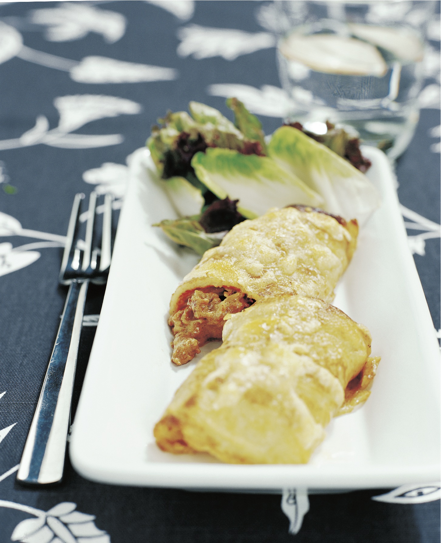 Lägg en klick köttfärs i varje pannkaka och rulla ihop dem.