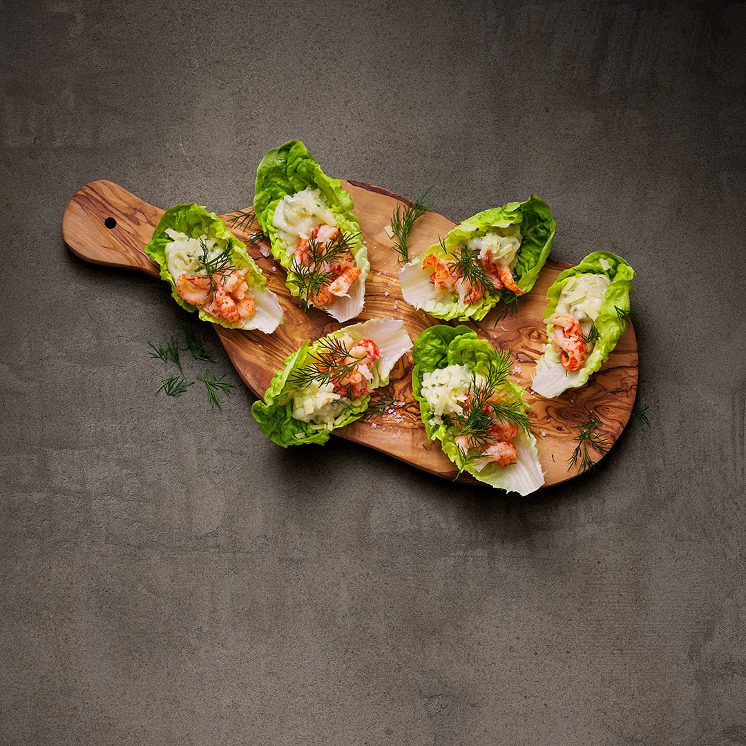 Servera hjärtsalladsbladen och majonnäsen på bordet i olika skålar eller montera ihop hjärtbladen med majonnäsen och toppa med kräftor och ännu mer örter innan servering.