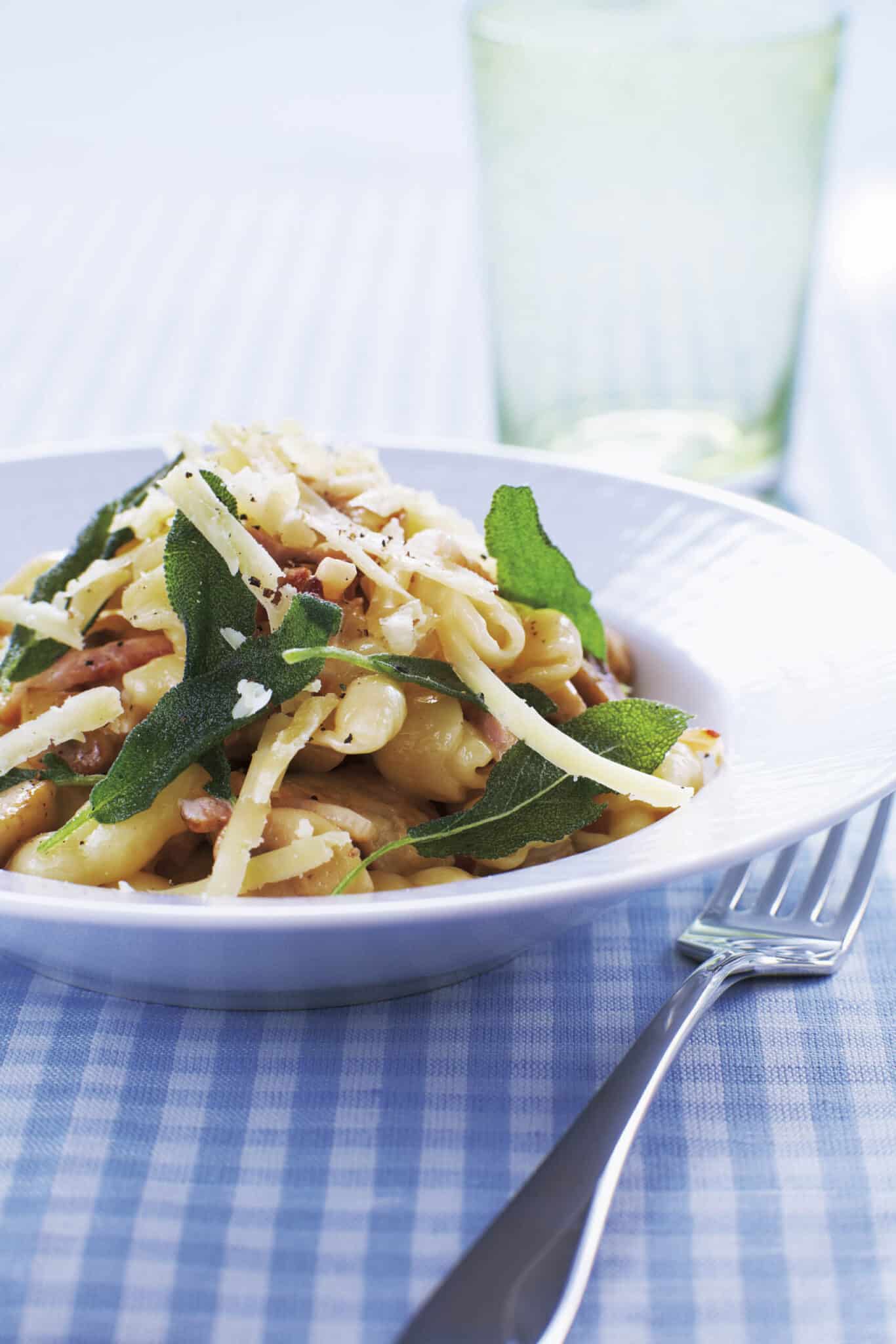 Lägg upp i en skål och lägg på salviablad, riven Västerbottensost och nymalen svartpeppar.