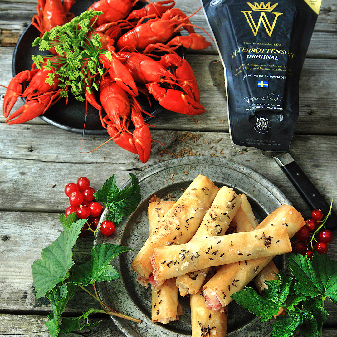 Kumminkryddade filorullar med Västerbottensost® och vinbär. Det här receptet är framtaget av Caroline i Köket i samarbete med Västerbottensost®