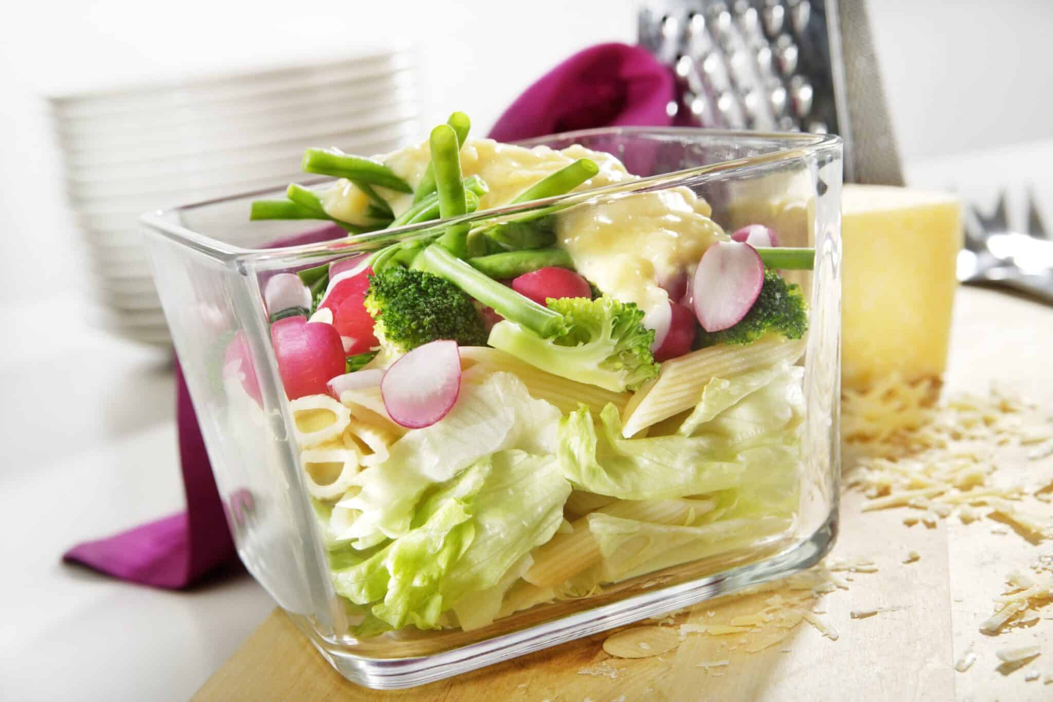 Koka pastan enligt anvisningar. Hacka rädisor och sallad och koka haricots verts och broccoli. Låt dem svalna något och tillsätt i salladen och blanda ner den färdigkokta pastan. Vispa ihop äggen med vattnet och tillsätt oljan droppvis samtidigt som du vispar kraftigt. Rör ner osten och smaka av med salt och peppar.