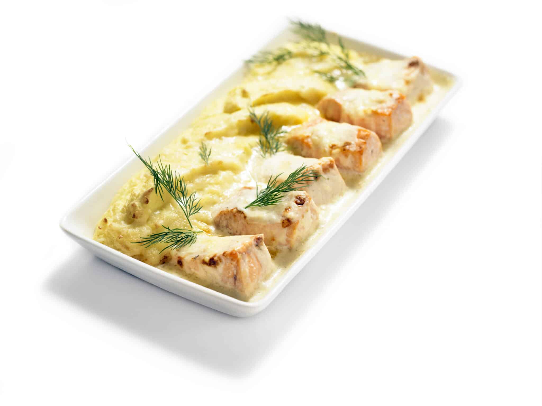 Klicka i potatismoset längs ena långsidan av en ugnsfast form.