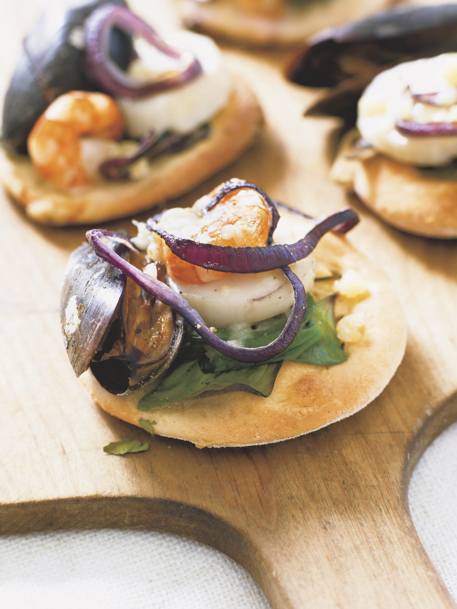 Halvera pilgrimsmusslorna. Tvätta blåmusslorna och knacka på dem. Kasta de som inte sluter sig. Dela degen i 20 små bitar. Kavla ut degen tunt. Fördela fyllningen och toppa med ost. Grädda i 10 min eller tills blåmusslorna öppnat sig och pizzorna fått fin färg. Strö över lite peppar.