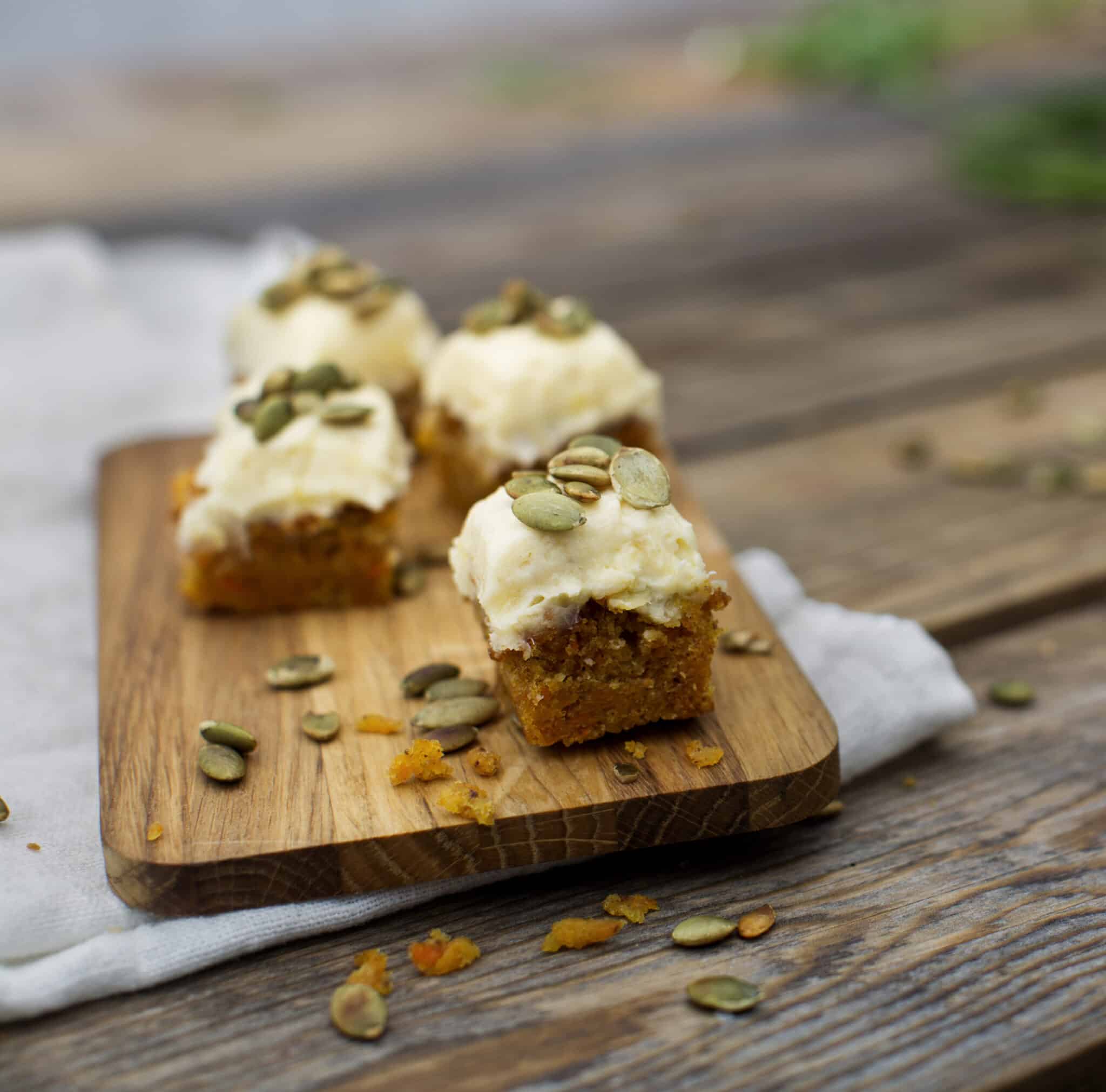 Vispa ägg och socker pösigt. Lägg i morötterna och tillsätt oljan. Blanda kanel, ingefära, vaniljpulver, bakpulver och vetemjöl separat och rör ned i den andra blandningen till en jämn smet. Häll smeten i ett bleck, cirka 33 x 53 cm. Grädda morotskakan i nedre delen av ugnen i 175 °C i cirka 45 minuter. Glasyr: Smält den vita chokladen i vattenbad och smält sedan ner Västerbottensost i den varma chokladen. Låt svalna. Blanda sedan chokladröran med crème fraiche och bred över den svala morotskakan. Garnera med pumpakärnor och skär upp i små munsbitar.
