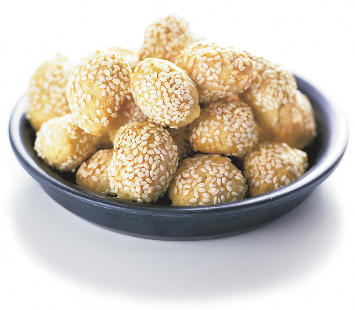 Lägg en oliv på varje klick deg, rulla ihop och panera i sesamfrön