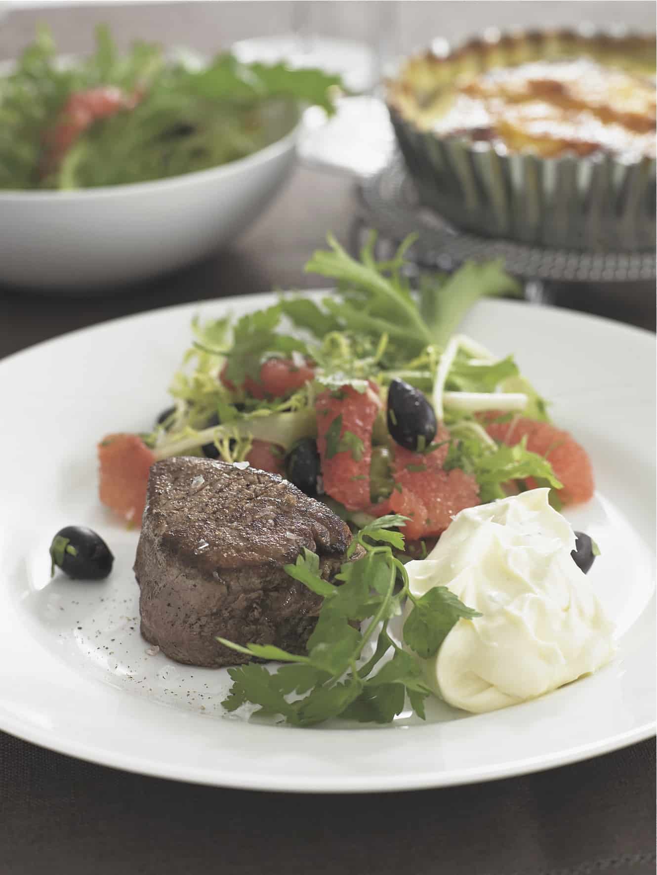 Servera oxfilén med potatistårta, grapefruktsallad och blue cheese-sås.