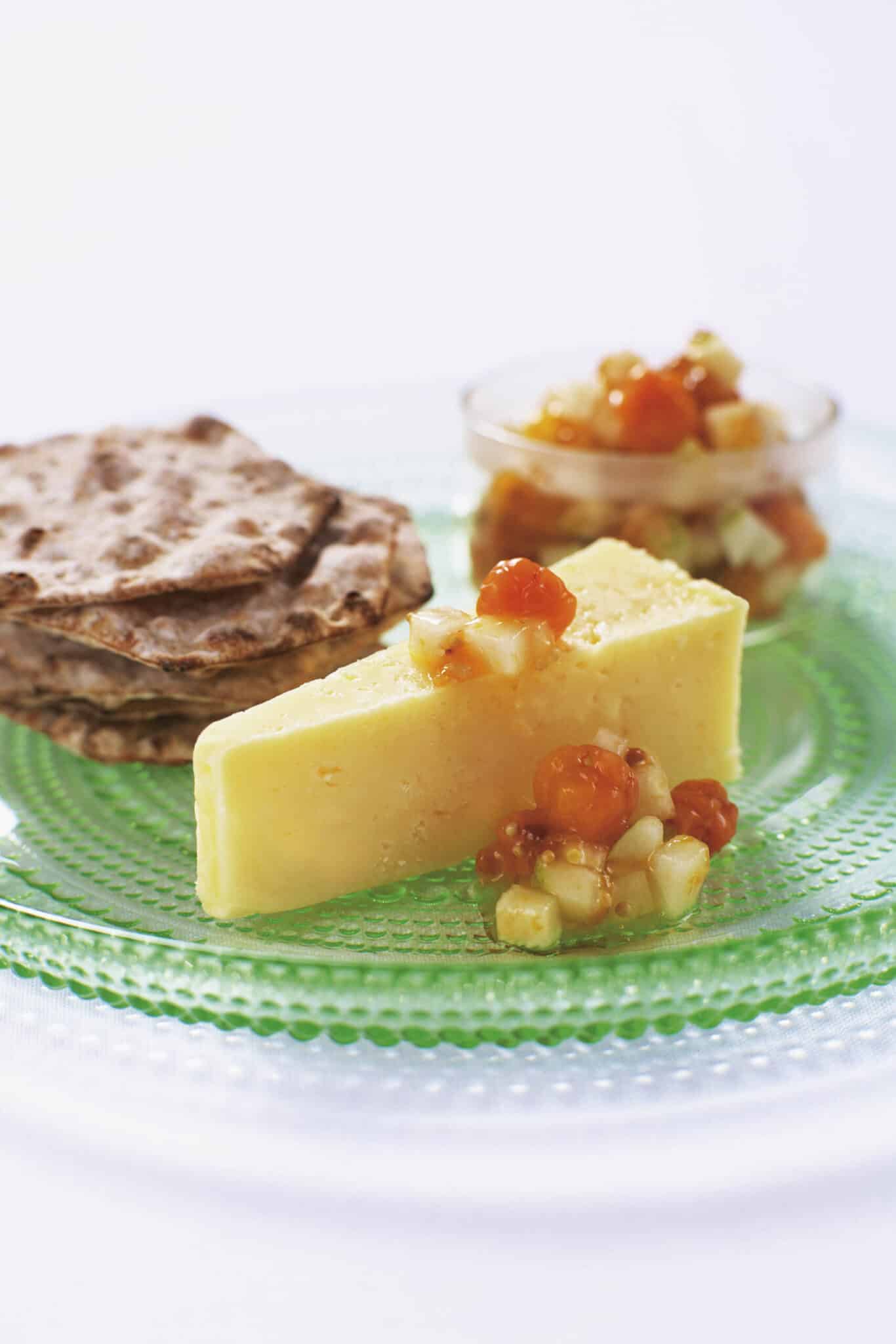 Skär päronen i små tärningar. Pressa över citronsaft så att inte bitarna mörknar. Stöt senapsfrön grovt i en mortel. Blanda sylten med päronbitar, senapsfrön och hjortron. Servera till en bit Västerbottensost och ljust tunnbröd.