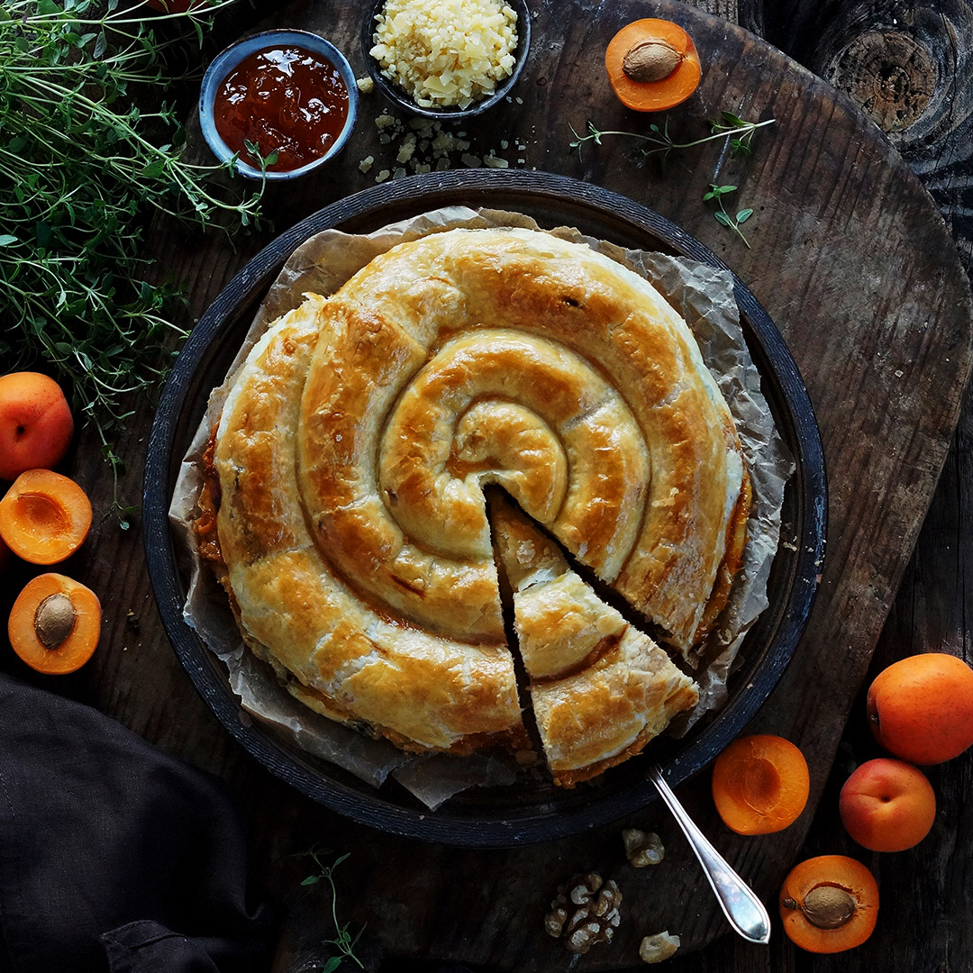 Njut av denna härliga och goda pirog med Västerbottensost och aprikosmarmelad. Smaksatt med timjan och valnötter för crunch. Det här receptet är ett samarbete mellan Kitchen of Anna och Västerbottensost®