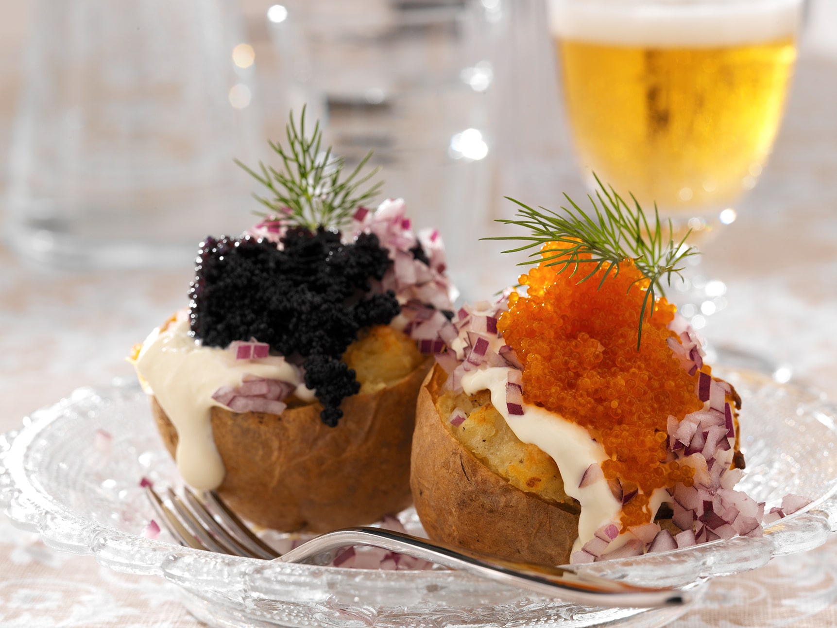 Potatis med Västerbottensost, rom, créme fraiche och rödlök