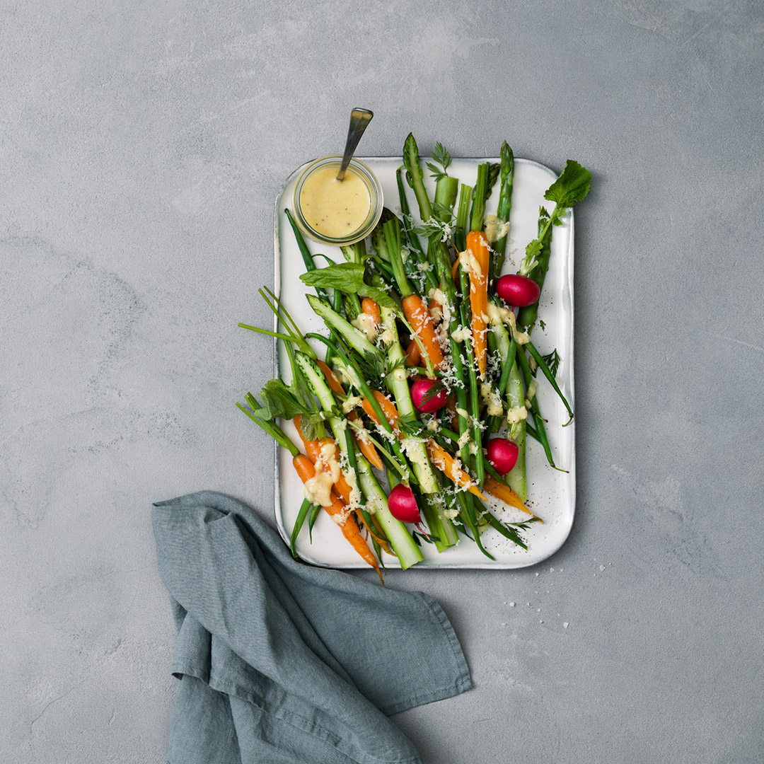 Njut av vårens första primörer i en sallad! Späda morötter och rädisor, haricots verts och vårens första sparris. Välj dina favoriter och servera med en härlig dressing med Västerbottensost®.