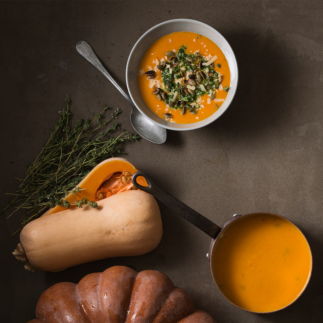 Vid servering: Strö pumpafrön och ringla lite örtolja över den varma soppan.