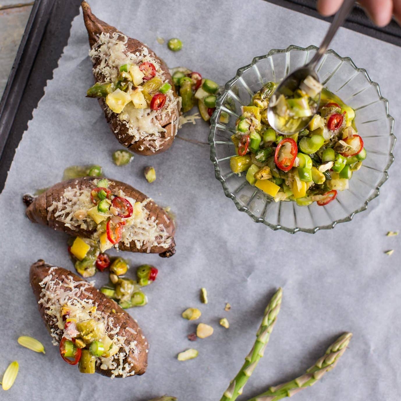Skär sparrisen i mindre bitar och blanda med citron, chili och de hackade pistagenötterna samt olivolja och 50 g Västerbottensost. Skeda hacket över sötpotatisen vid servering.