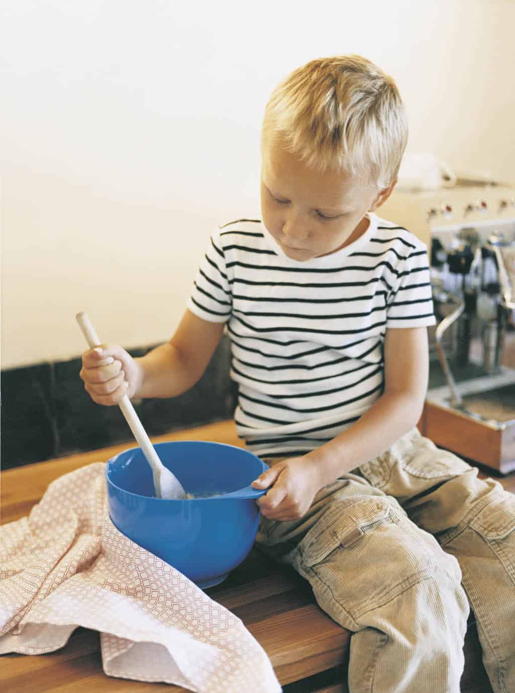 Blanda alla torra ingredienser och finfördela smöret i mjölblandningen.
