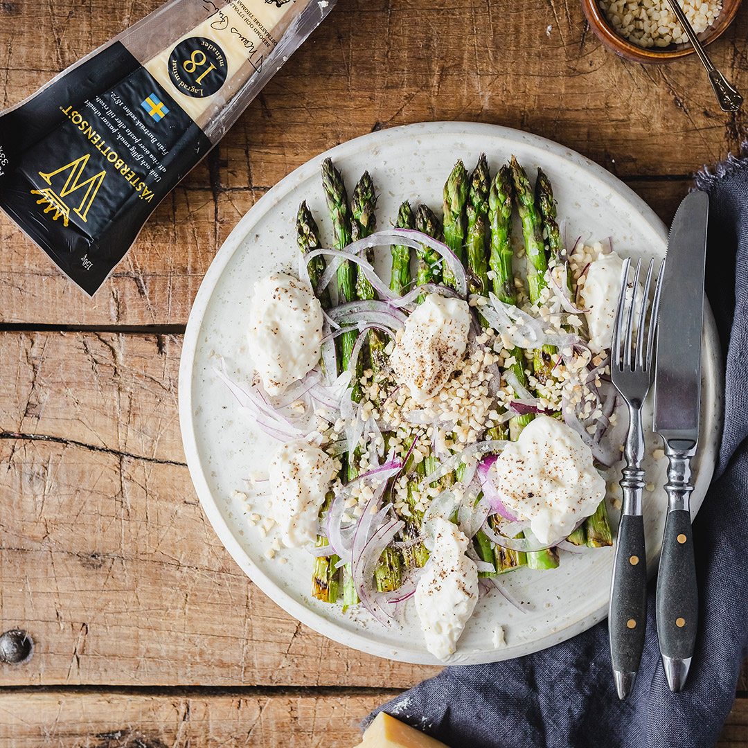 Sparris med en kräm på Västerbottensost är ett perfekt tillbehör till grillat. Passar både till fisk, kyckling eller kött.