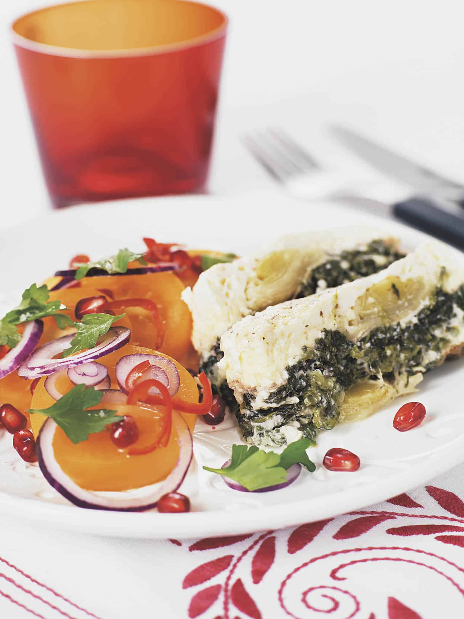 Sätt ugnen på 200°. Smörj en aluminiumform. Skölj och separera alla purjolöksblad från varandra. Tina och krama vätskan ur spenaten. Blanda grädden med ägg, ost, och kryddor. Fyll botten på formen med purjolöksblad och fyll på med gräddblandning. Varva spenat och gräddblandning tills formen är fylld. Baka i vattenbad i cirka 1-11/2 timme. Låt patén svalna. Skär tomaterna i tjocka skivor och plocka ur kärnorna ur granatäpplet. Rensa chilin från kärnor och skär den och löken i tunna ringar. Lägg upp allt på ett fat och pressa över citron och ringla på lite olja. Salta, peppra och dekorera med bladpersilja.
