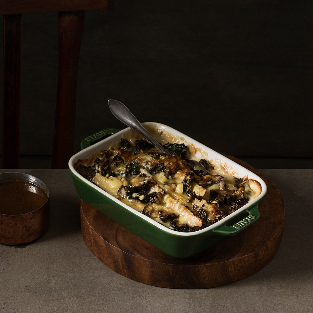Fördela svartrötterna, svartkål och svamp i en ugnsform.