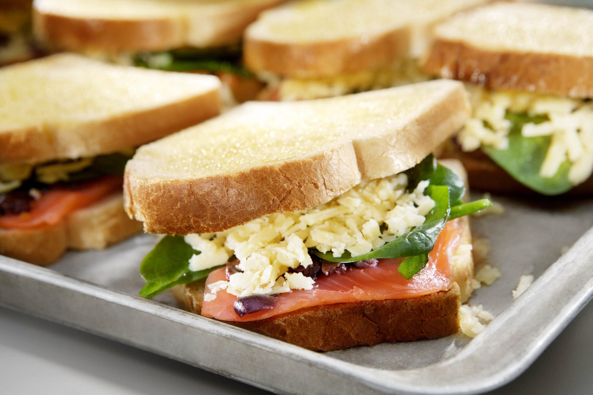 Vänd ihop spenaten i en skål med salt, peppar och 1 msk olivolja så att den ”faller ihop”. Fördela spenaten och strö över osten. Lägg på de resterande brödskivorna och grilla dem i smörgåsgrillen.