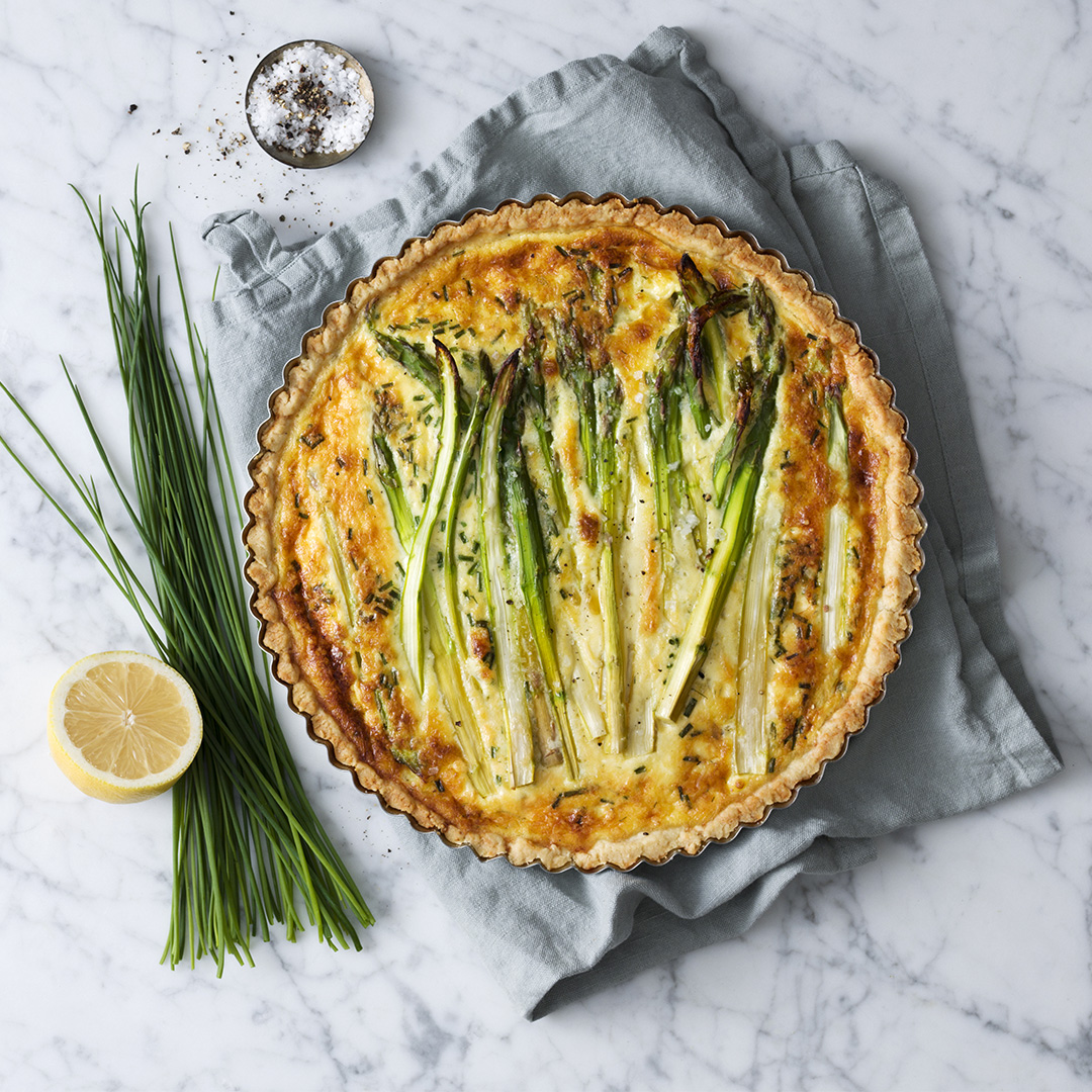 Vispa samman ägg, Västerbottensost, grädde, gräslök, rivet citronskal, salt och peppar. Häll fyllningen i pajskalen och fördela sparrisen ovanpå. Toppa med lite extra riven Västerbottensost och olivolja och grädda i mitten av ugnen ca 15 minuter för små portionspajer eller 30 minuter för en stor paj.