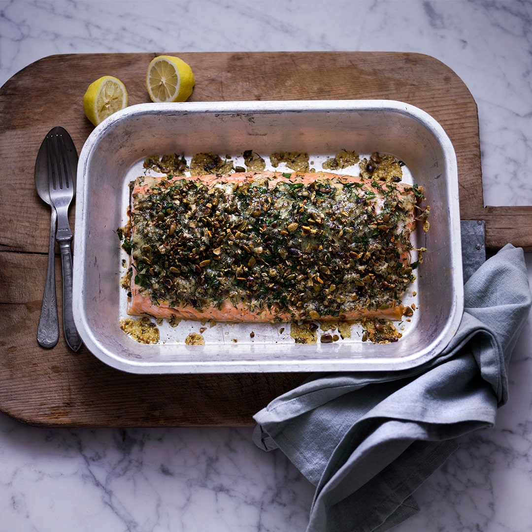 Herb-baked salmon with a blanket of roasted pumpkin kernels, herbs & Västerbottensost. Serve with boiled potatoes!