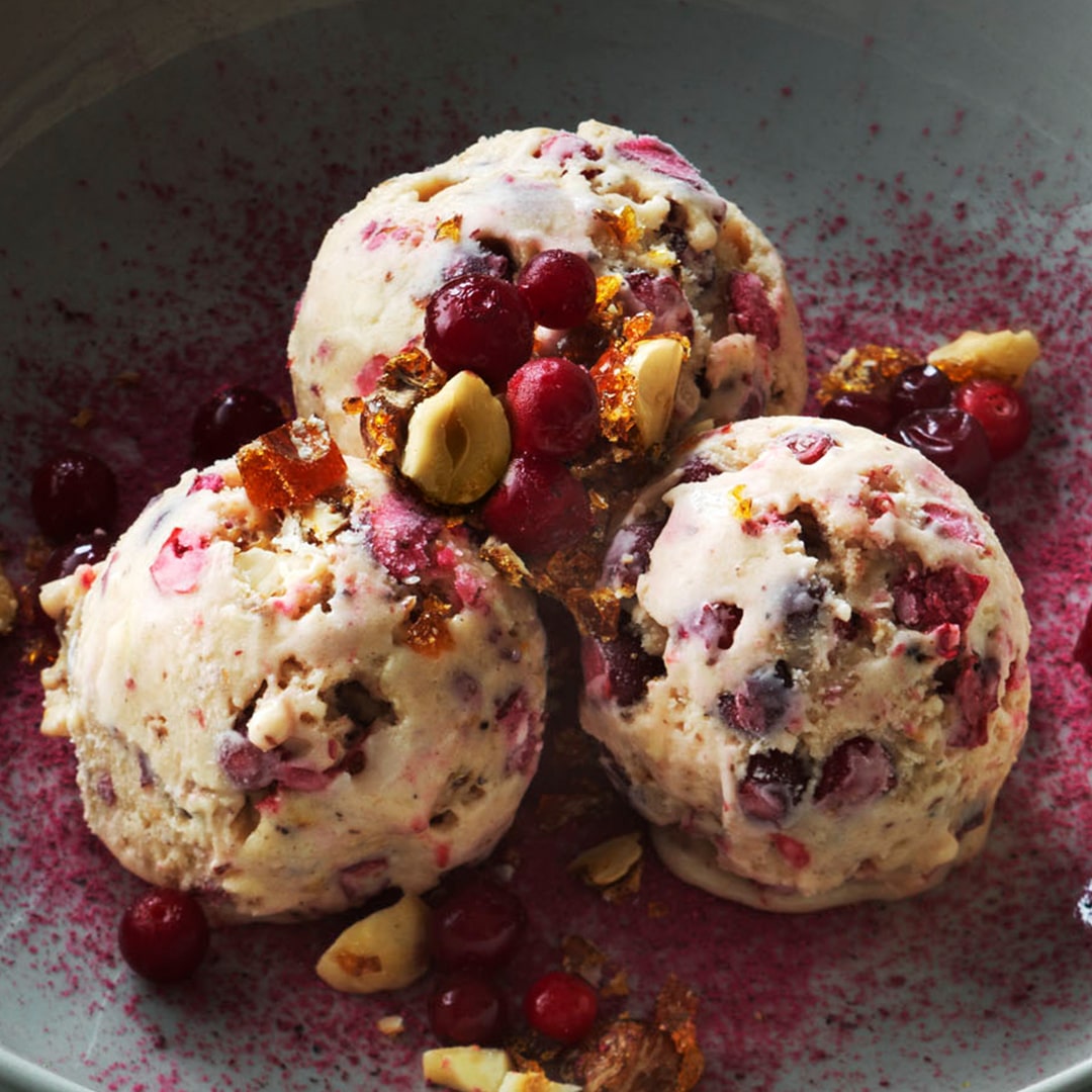 Lingonberry ice cream with Västerbotten cheese® and candied hazelnuts
