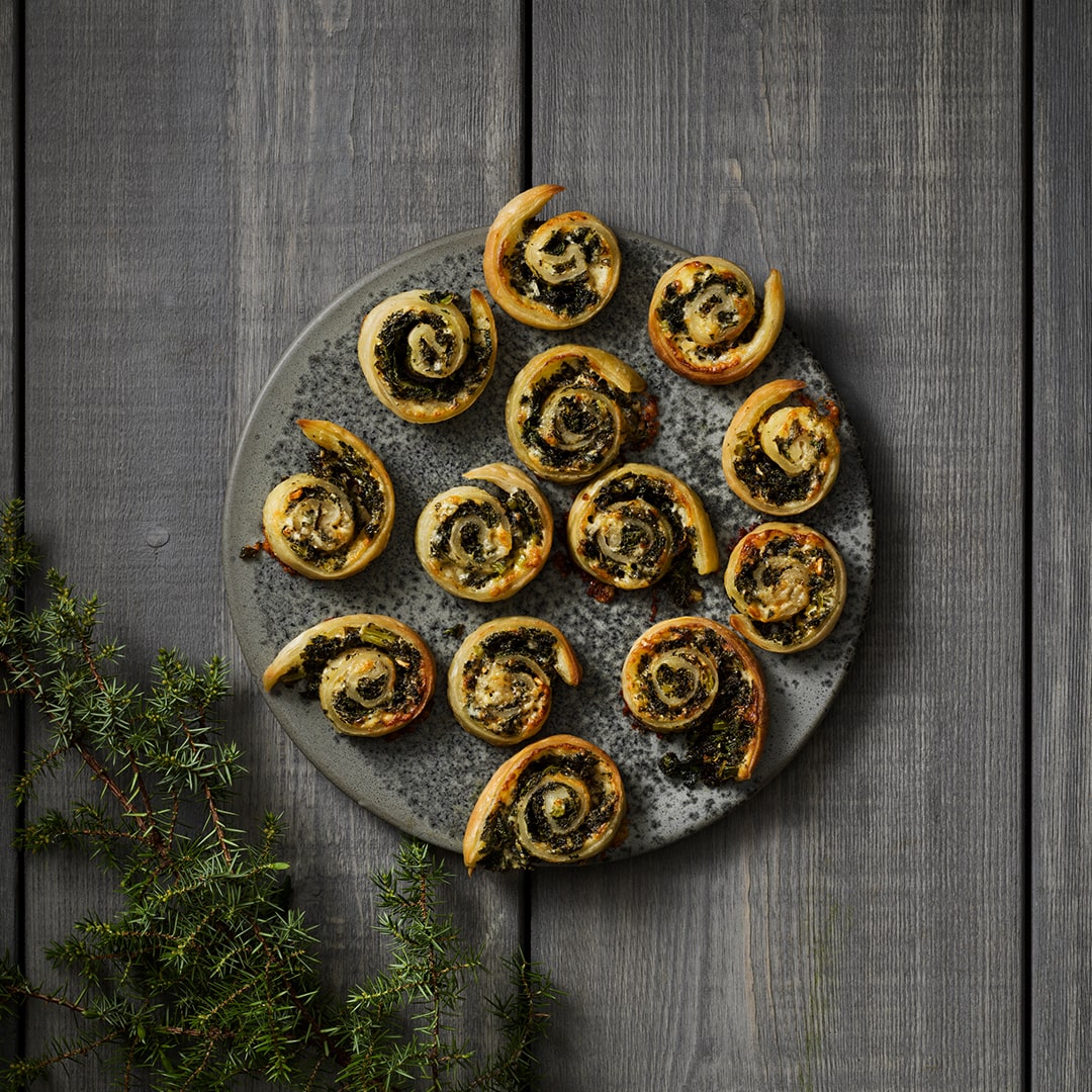 Puff pastry spins are a perfect snack when guests arrive. Here with kale and Västerbotten cheese®.