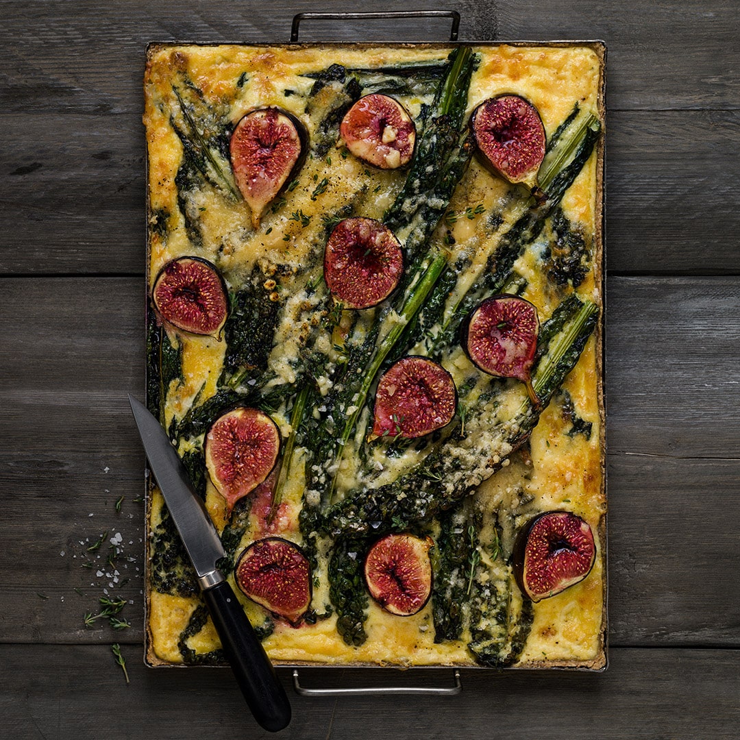 Sauté the onion with oil in a skillet. Add black cabbage and sauté it softly. Alternate onions and black cabbage in the pie crust. Whisk together eggs, cream, 2 cups grated Västerbotten cheese®, salt and pepper and pour into the pie shell. Top with figs and the remaining Västerbotten cheese®. Bake in the middle of the oven for about 30 minutes or until the pie is nicely browned.