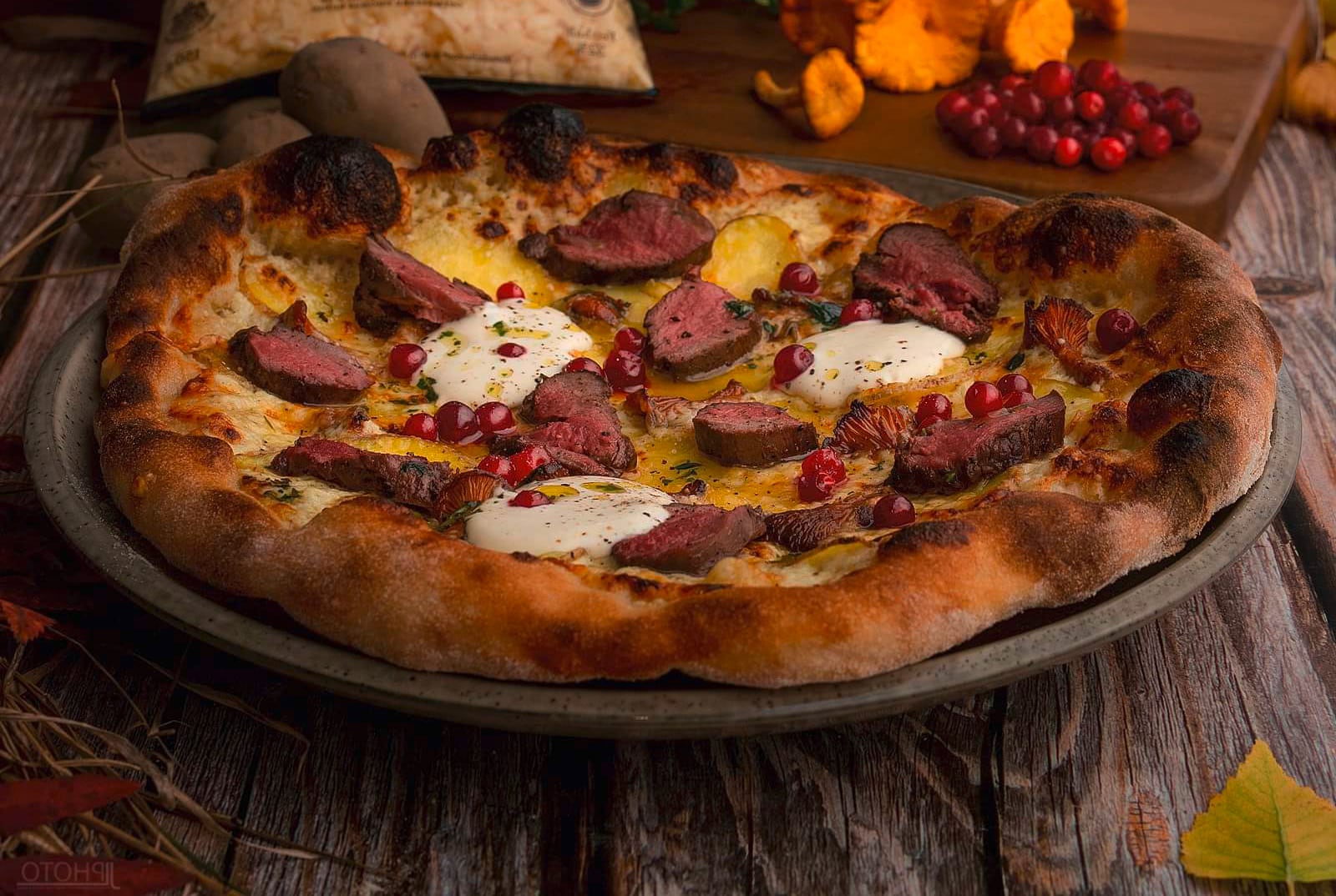 Västerbottens landskapspizza är en hyllning till norrländska smaker och råvaror. Pizzabottnen täcks med crème fraiche från lokala bönder, Västerbottensost®, tunt skivad mandelpotatis samt smörstekta kantareller. Pizzan toppas med helstekt renfilé, picklade lingon, timjanolja, brynt smör och mer Västerbottensost.