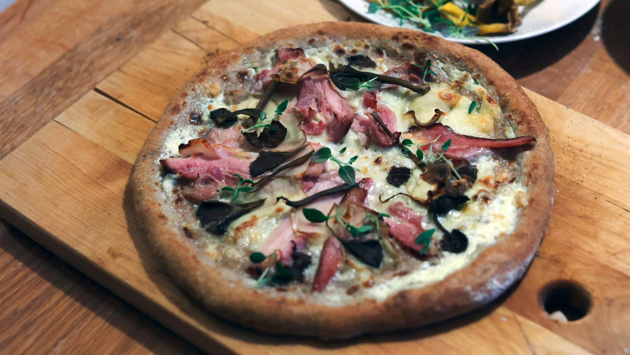 Upplands landskapspizza är en hyllning till de uppländska skogarna, gårdarna, åkrarna, betesmarkerna och rapsfälten. Pizzabottnen på stenmalt vårvetemjöl täcks med crème fraiche och Västerbottensost® samt potatis, trattkantareller, rökt sidfläsk och timjan.