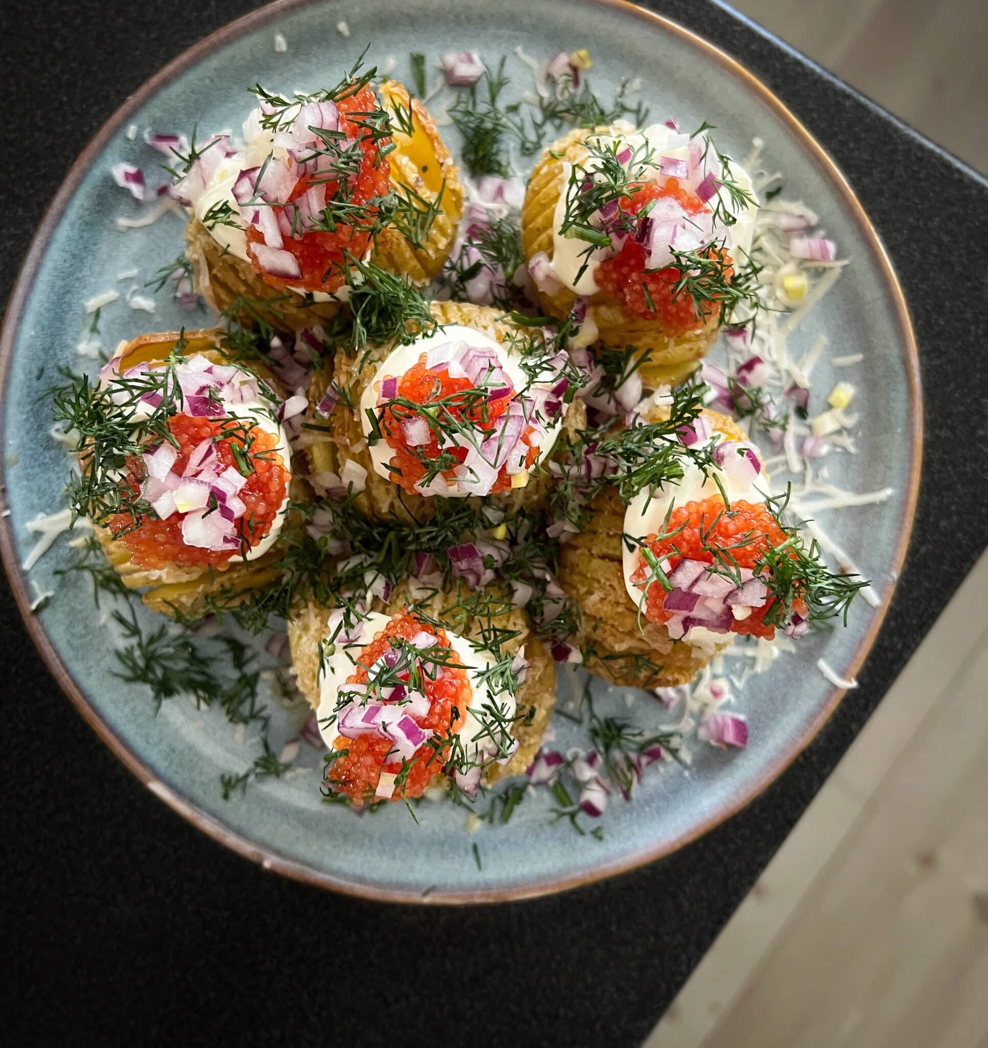 Ta ut potatisen och låt svalna någon minut. Lägg på ytterligare Västerbottensost och övrig topping. Servera direkt – njuuut!