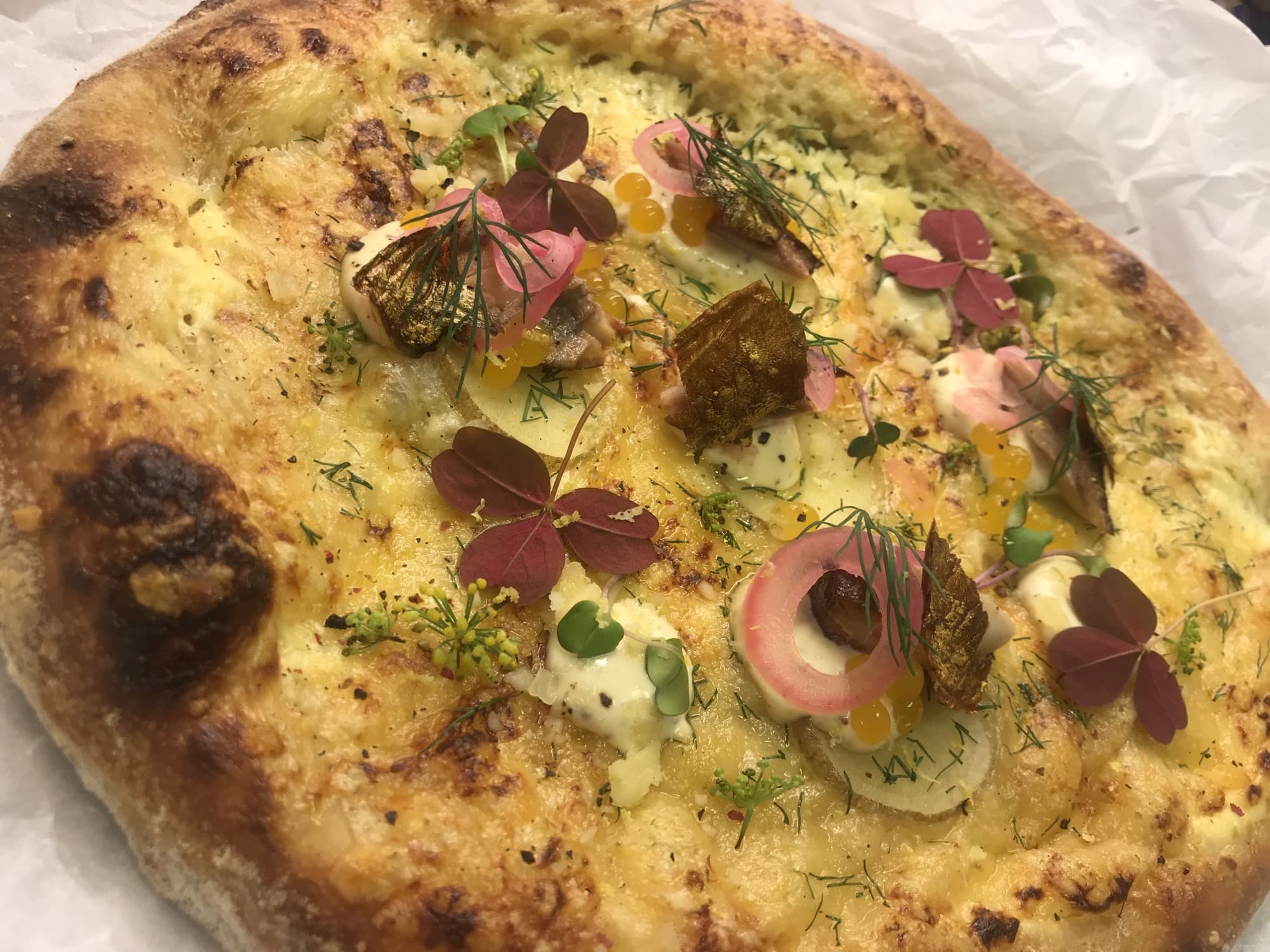 Blekinges landskapspizza är en hyllning till det lokala sillfisket och den långa traditionen av att röka fisk. Klassiska smaker som rökt böckling, kokt potatis, dill och Västerbottensost® möts upp av en elegant syra i form av picklad rödlök, citron- och senapskräm samt citronzest. Tunt skivad fänkål och chips på det gyllene skinnet från böcklingen bidrar med lite extra krisp och gör rätten vackrare.