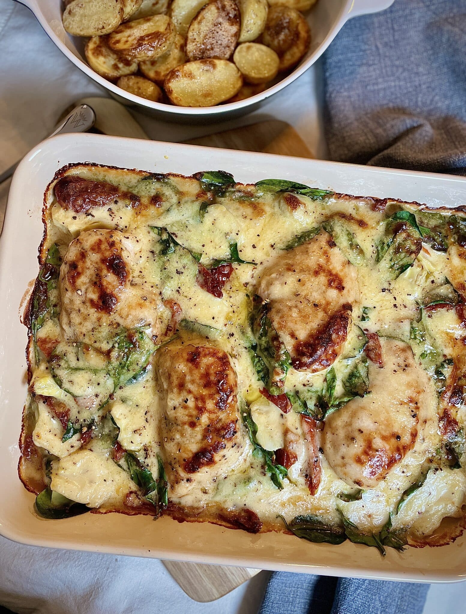 En krämig och lyxig kycklinggratäng med kronärtskockor, soltorkade tomater och spenat. Serveras förslagsvis med ugnsrostad potatis.