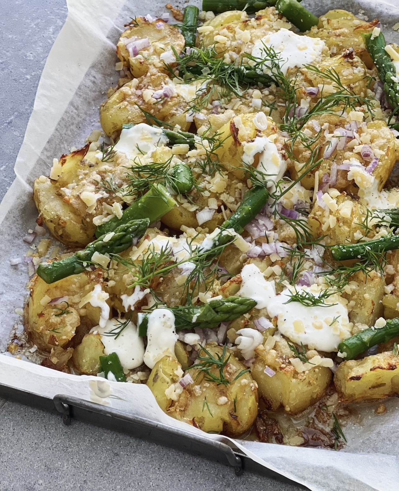 Den här rätten är en av de godaste potatisrätterna jag vet. Kombinationen ljumma potatis, Västerbottensost, sparris och brynt smör är magisk och tillsammans med creme fraiche, dill och rödlök blir rätten fulländad!