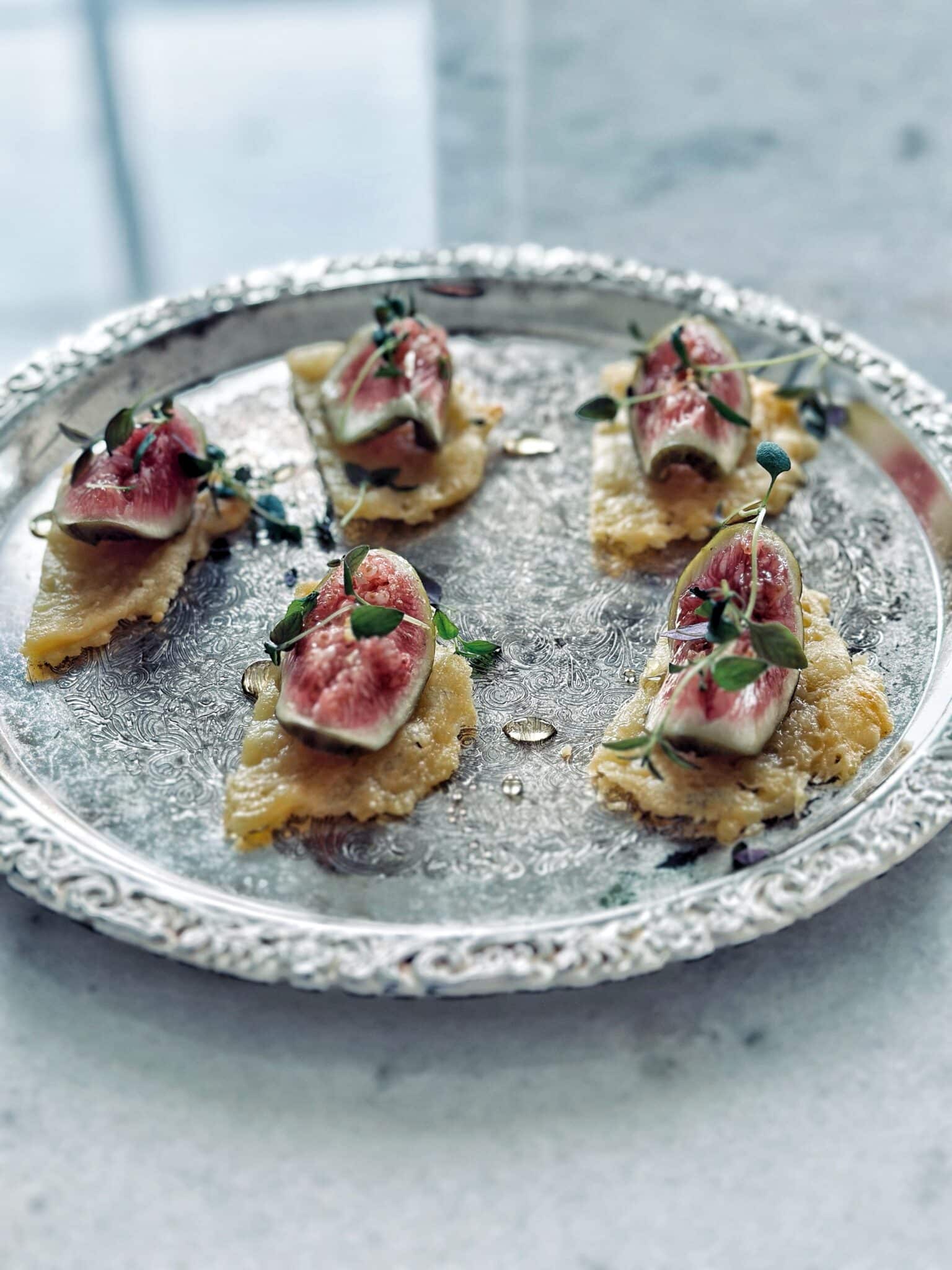 Toppa chipsen med skiva färska fikon, honung och timjan.